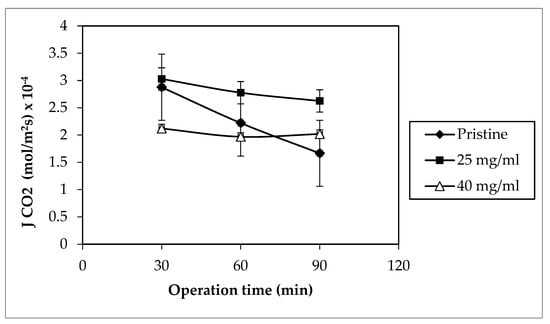The CO2 absorption flux results for the selected membranes were averaged and are illustrated against the operation time in Figure 8 below. Based on the graph represented, 25 mg modified membrane held the highest average CO2 absorption flux at 3.03 × 10−4 mol m−2 s−1 followed by the pristine membrane with MEK at 2.88 mol m−2 s−1, while the modified membrane with MEK at 40 mg mL−1 held the lowest average at 2.12 × 10−4 mol m−2 s−1. Although the membrane hydrophobicity is crucial, the coating thickness also plays a huge role in determining the offset of the CO2 absorption flux, as mentioned in previous works [,]. In the case of 40 mg modified membrane, the membrane’s contact angle surpassed those of the other selected membranes, thus giving an edge in its hydrophobicity. High hydrophobicity enabled the membrane to withstand the wetting inflicted by the absorbent liquid. This attributed to its CO2 absorption flux stability, which varied slightly from 2.12 × 10−4 mol m−2 s−1 to 2.02 × 10−4 mol m−2 s−1 over the period of operation. However, the thick coating layer deteriorated the membrane hydrophobicity advantage by increasing the mass transfer resistance for gas absorption [].