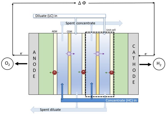 The concept of converting salinity gradients to energy by mixing fresh and saltwater was first introduced by Pattle in the 1950s [9]. Since then, various groups have studied the potential for power generation by SGE using different technologies [10,11,12]. At present, pressure retarded osmosis (PRO) and RED are the most promising technologies for exploiting salinity differences in naturally occurring waters [1,2,13,14]. In RED, controlled mixing is achieved by separating alternate layers of freshwater and saltwater with alternating cation and anion exchange membranes (AEMs/CEMs). The result is a net flux of ions through the stack. Electrodes on each stack end convert the ionic current to electric current conducted through an external circuit [15,16]. A schematic sketch is given in Figure 1.