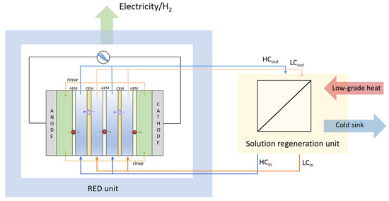 By coupling a SGE unit with a regeneration unit that restores the initial concentrations of the HC and LC feed stream, a closed-loop SGE engine is obtained. The concept is shown in Figure 2, with a RED stack as a power unit and a thermal regeneration unit. An essential benefit of the RED Heat Engine and Salinity Gradient Energy Storage is the possibility of closed systems with solid control of fouling challenges [22]. Using low-grade waste heat enhances the overall energy efficiency of the production cycles and the exploitation of an energy source that is readily available [23]. Furthermore, while a conventional RED stack for power production depends on the availability of both dilute and concentrate solutions at the same site, the REDHE is run on a finite recirculated amount of salt solution. This allows for much more flexibility in the system’s location and liberates it from the demand of working with readily available solutions found in the environment (e.g., seawater and river water). Consequently, the working solution can be selected by primarily optimizing the energy production, which is substantially determined by the properties of the salt solution, such as concentration, temperature, and presence of multivalent ions [7]. By using synthesized salt solutions with optimal characteristics for RED, problems as membrane fouling, or the necessity for pre-treatments to mitigate membrane-fouling, can be avoided leading to cost and energy savings. However, the concept of a REDHE as a closed-loop system requires regeneration of the working fluids (i.e., restoring the initial concentration gradient of the LC and HC stream after passing through the power unit).