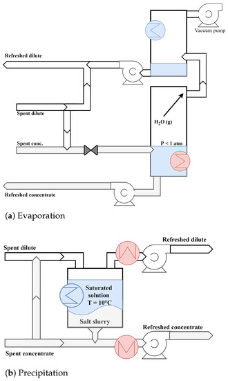 Schematic description of a thermal solution regeneration by (a) evaporation and (b) precipitation. A red heat exchanger depicts heat added to the system, whereas a blue heat exchanger marks heat withdrawn.