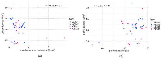 IEMs can further be synthesized by pore-filling techniques in which monomeric/polymeric electrolytes are impregnated onto a porous substrate [99,100,101]. Pore-filling membranes PCEM and PAEM represented much lower area resistance (0.42 Ω) than Fujifilm type commercial CEMs (2.10 Ω) and AEMs (1.22 Ω), thereby displaying a higher power density of 1.95 compared to commercial membranes (1.46 ) [99]. Despite the same IEC values of pore-filling and commercial membranes, the swelling degree of pore-filling membranes was lower due to a more hydrophobic character of electrolyte polymers restrained by porous substrates. This provides reasonable mechanical stability without needing additional reinforcement of the membrane, which increases the area resistance.