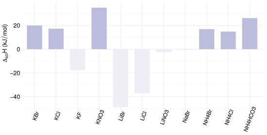 - Hubert, N.; Solimando, R.; Pere, A.; Schuffenecker, L. Dissolution enthalpy of NaC1 in water at 25 °C, 45 °C and 60 °C. Determination of the Pitzer’s parameters of the HzO-NaC1 system and the molar dissolution enthalpy at infinite dilution of NaC1 in water between 25 °C and 100 °C. Thermochim. Acta 1997, 294, 157–163. [Google Scholar] [CrossRef]