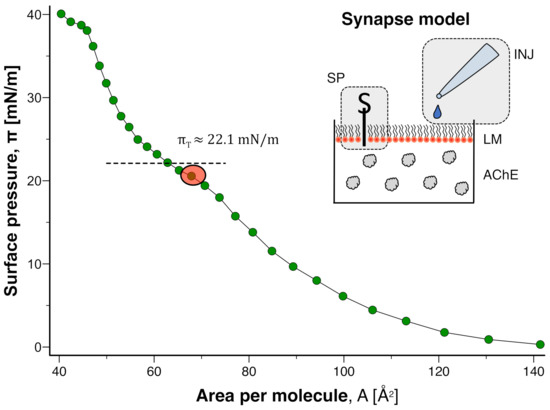 Isothermal state diagram of DMPS monolayer on standard subphase (100 mM NaCl, 0.5 mM phosphate buffer, pH set to at °C). (dashed horizontal line) Transition pressure . (red circle) Initial states for injection experiments. Data series is a representative example taken from a set of measurements. (inset) The setup is a simple model of a cholinergic synapse. Substances can be injected (INJ) in vicinity of a lipid membrane (LM) whose state is monitored with a surface pressure sensor (SP). The subphase contains acetylcholinesterase (AChE).