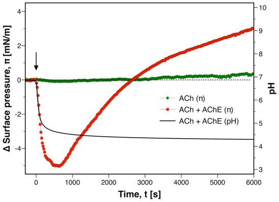 Catalytic hydrolysis of acetylcholine (ACh) triggers state change in DMPS monolayer. Changes of surface pressure (left axis) and subphase pH (right axis) when ACh was injected (arrow) onto a DMPS monolayer. The subphase either did (red circles) or did not (green diamonds) contain acetylcholinesterase. Each data series is a representative example taken from a set of measurements.