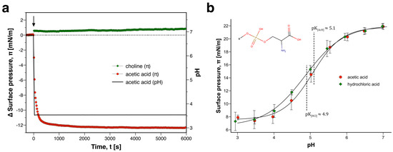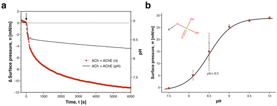 PA is peculiar among phospholipids in that it can carry two negative charges on a minimally sized headgroup. The first proton on its phosphate dissociates readily ( 3–4), but the second one has a significantly higher pK. is ≈8.5 in pure PA membranes in 0.1 M salt solution. In mixed membranes it can be down-shifted, for instance, to in PC host bilayers [41]. This down-shift can be even more pronounced when the membrane contains suitable hydrogen-bonding partners, e.g., there is a shift to ≈7 in presence of PE [41]. To determine if a lipid interface of PA or PIP is indeed also more sensitive to ACh, we repeated our experiments with monolayers made from DMPA (Figure 4). Titration of the membrane indicated that , which is in very good agreement with the literature [43]. In the regime of the pK, even more pronounced changes of lateral pressure as compared to PS took place ( mN/m between pH and ). It has to be noted, however, that the “true” pK may differ slightly from the experimentally obtained one (Figure 4b). The titration curve was neither fully reversible in the case of PS nor in case of PA. i.e., back-titration with an equivalent amount of NaOH did not restore the initial state, but rather a state with lower lateral pressure. In all likelihood, this lack of reversibility was due to detachment of lipid into the subphase during titration. This may have slightly biased the diagram and thus the pK.