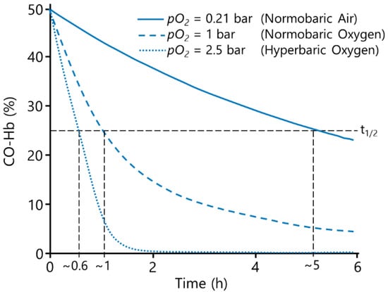 In room air, the half-life of carbon monoxide is approx. 320 min [5]. The current treatment of CO poisoning is normobaric oxygen (NBO) or hyperbaric oxygen (HBO), as the elimination of CO increases with increased O2 concentrations [4,9], see Figure 1. NBO is rapidly available and usually immediately initiated, decreasing the CO half-life to approx. 74 min [5]. HBO increases the physically solved O2 further, whereby the CO-Hb half-life is reduced drastically, resulting in a CO half-life of approx. 20 min [5]. The use of HBO compared to NBO was found to reduce the incidence of cognitive abnormalities from 33% to 18% [10]. However, while the rationale of the HBO treatment is compelling, up to date the use of HBO for the treatment of CO poisoning remains controversial, as there is no sufficient evidence of its benefits [9,11]. A recent review by Roderique et al. [7] even cautions for the use of HBO, as it further increases reactive oxygen species, potentially exacerbating the damage that is already occurring. Furthermore, in practice the limited number of hyperbaric chambers presents a major issue in therapy. A recent study by Chin et al. [12] concluded that only 11.9% of 361 surveyed hyperbaric centres in the USA were sufficiently equipped for dealing with emergency cases. Especially in remote areas the coverage is insufficient at best, resulting in transportation times of several hours to a hyperbaric chamber. Furthermore, the long preparation time of most available chambers further delays the rapidly needed therapy, even in metropolitan areas [5,9,13]. Additionally, a patient’s comorbidity such as, e.g., acute respiratory distress syndrome (ARDS) or chronic obstructive pulmonary disease (COPD) may mitigate the use of NBO and HBO, as the CO elimination takes place in the lungs [14,15]. Therefore, novel treatment options are needed [5].