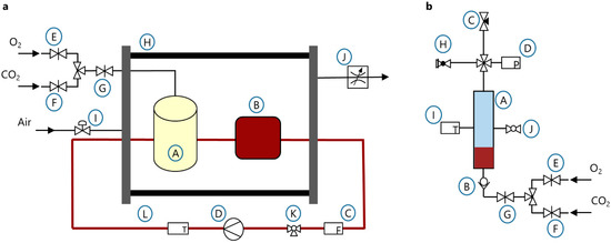 The experimental setup can be seen in Figure 2b. A standard process engineering bubble column (A) (SCHOTT AG, Mitterteich, Germany) was used as a batch oxygenator. The blood inlet and a porosity 2 VitraPOR® micro-immersion filter (ROBU® Glasfilter-Geräte GmbH, Hattert, Germany) for gas dispersion and pressure build-up were located in the bottom of the column. The filter was connected via tubing and a check valve (B) to MASS-VIEW® MV-304 controllers (E–G) (Bronkhorst High-Tech B.V., AK Ruurlo, The Netherlands), controlling the gas flow into the bubble column. A needle valve (C) to regulate the gas outflow was placed at the top of the column. Thus, by matching in- and outflow, a constant excess pressure could be maintained. The corresponding pressure sensor (D) (A-10, WIKA SE and Co. KG, Klingenberg, Germany) and a safety relief valve (H) (855811318001, ESSKA, Hamburg, Germany) were also connected to the top of the column. Furthermore, the top of the column was filled with filters from a cardiotomy reservoir (MVC 4030, XENIOS AG, Heilbronn, Germany) to prevent foam from rising. A temperature sensor (I) and a sampling port (J) were mounted in the middle of the column.