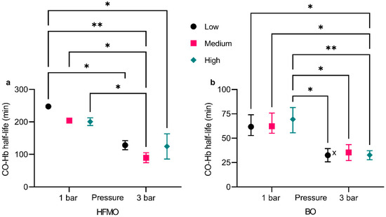 CO-Hb half-life with (a) HFMO and (b) BO dependent on pressure and flow rate. The whiskers represent the highest and lowest values of the corresponding experiments. Flow rate stands for blood flow rate for HFMO experiments and for gas flow rate for BO experiments. Note the different scale of the axes. (*) p ≤ 0.05, (**) p ≤ 0.01. (x) During one experiment, bubbles inside the samples prevented the analysis.