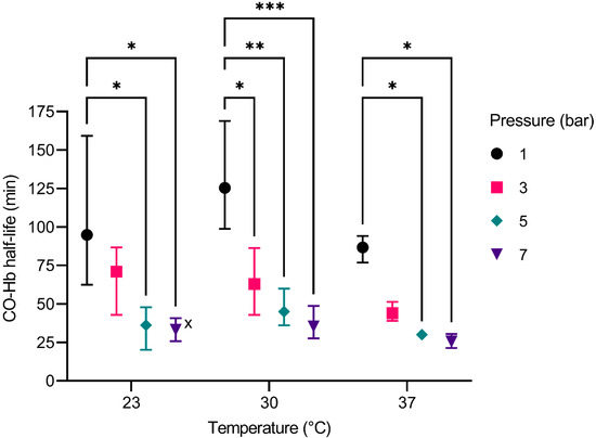 CO-Hb half-life of the revised BO dependent on temperature, and pressure. The whiskers represent the highest and lowest values of the corresponding experiments. (*) p ≤ 0.05, (**) p ≤ 0.01, (***) p ≤ 0.001. (x) One experiment was excluded due to extensive foam formation inside the BO.