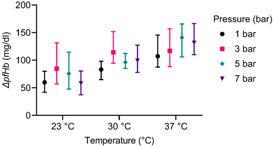 The increase in plasma free hemoglobin during the experiments dependent on temperature and pressure is displayed in Figure 6. For the original data, see supplementary information (Table S4). The overall influence of the temperature is considered significant (p ≤ 0.001); experiments at higher temperatures generally result in higher concentrations of plasma free hemoglobin than experiments at lower temperatures. For experiments at 5 bar and 7 bar for example, the concentration of plasma free hemoglobin doubles with an increase in temperature from 23 °C to 37 °C. The overall effect of the pressure on the plasma free hemoglobin is considered not significant.