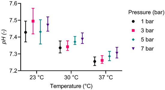 pH-value dependent on temperature, and pressure. The whiskers represent the highest and lowest values of the corresponding experiments.