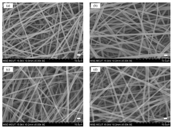 The shapes and structures of nanofiber membranes (PAN, P-COOH, P-COOH-CS, and P-COOH-CS-CEW) are shown in the SEM images (Figure 3). For all the fabricated nanofiber membranes, the nanofibers were randomly oriented and in the size range of 400–600 nm. The P-COOH film contained a rough structure. After the surface modification of P-COOH with chitosan and CEW, the thickness of nanofibers of P-COOH-CS-CEW increased marginally. Nevertheless, no obvious change in the overall nanofiber shape was observed. In addition, the surface of the nanofiber membrane modified with CEW protein is partially opaque, showing the presence of charge.