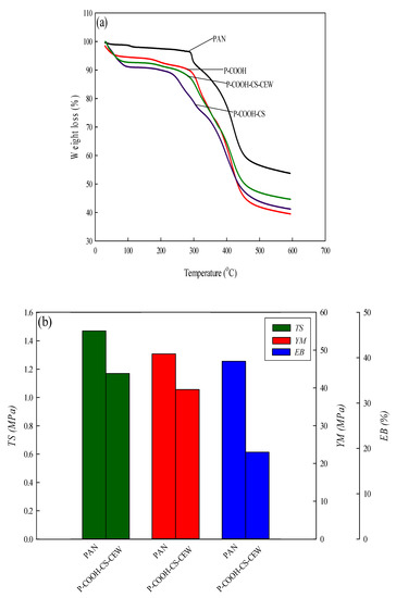 (a) TGA curves of PAN, P-COOH, P-COOH-CS, and P-COOH-CS-CEW. (b) Mechanical properties of PAN and P-COOH-CS-CEW samples: TS, YM, and EB.