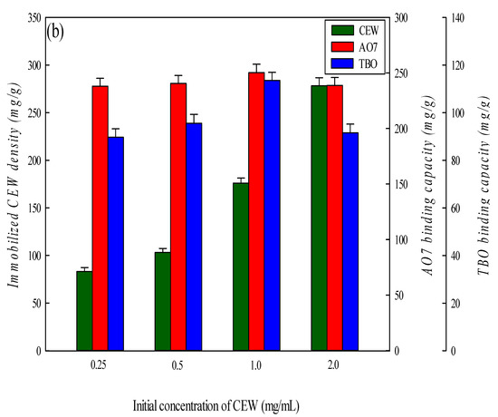 The effect of loaded concentration of CEW (0.25–2.0 mg/mL, 5 mL) on the immobilized density of CEW on the P-COOH-CS-CEW nanofiber membrane was investigated, and the results of immobilized density of CEW on the membranes are given in Figure 5b. By increasing the amount of CEW in the reaction solution from 0.25 mg CEW/mL to 2.0 mg CEW/mL, the binding capacity for AO7 and TBO dyes reached the maximum value of 1.0 mg CEW/mL. However, at the CEW concentration beyond 1.0 mg/mL, the immobilization density decreased to 238.78 mg/g for AO7 and 91.56 mg/g for TBO at a loaded concentration of 0.25 mg CEW/mL. The binding capacity of the P-COOH-CS-CEW nanofiber membrane for AO7 and TBO dyes was decreased by the loaded CEW concentration greater than 1.0 mg/mL. The reduction in binding capacity may be due to the effect of steric hindrance. Hence, the loaded concentration of CEW in the synthesis of P-COOH-CS-CEW nanofiber membrane was fixed at 1.0 mg/mL.