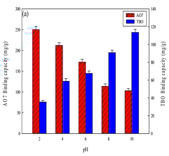 In an acidic environment (e.g., pH 2), the electrostatic interaction between the anionic (i.e., sulfonate) group of AO7 and the cationic group on the nanofiber membranes could be governed by the residual ammonium groups (-NH3+) either on the chitosan or on the CEW proteins. Conversely, in an alkaline environment (e.g., pH 10), the interaction between cationic (i.e., ammonium) group on TBO dye and anionic group (carboxyl) on the nanofiber membranes could be facilitated by the residual acidic group (-COO−) either on the P-COOH or on the CEW proteins. The results are shown in Figure 6a. Previous studies have shown that the negatively charged AO7 dye has a higher binding affinity toward the positively charged membrane in an acidic solution (pH 2), while the positively charged TBO dye shows a higher binding affinity toward the negatively charged membranes in an alkaline solution (pH 10) [2,37,40,45]. Hence, in this work, the optimal pH for the adsorption of AO7 and TBO dyes are pH 2 and pH 10, respectively.