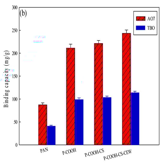 Different nanofiber membranes (i.e., PAN, P-COOH, P-COOH-CS, and P-COOH-CS-CEW) were investigated to determine their binding efficiency of AO7 (pH 2) and TBO (pH 10) dyes (1 mg/mL, 5 mL, 25 °C). The binding efficiencies of nanofiber membranes are shown in Figure 6b. The decreasing order of the binding efficiency is given as: P-COOH-CS-CEW (AO7 250.35 mg/g, TBO 113.56 mg/g) > P-COOH-CS (AO7 240.28 mg/g, TBO 103.19 mg/g) > P-COOH (AO7 106.67 mg/g, TBO 98.50 mg/g) > PAN (71.31 mg/g, 40.71 mg/g). The ability of these nanofiber membranes to bind the dyes may be dependent on the hydrophobic, hydrophilic, and ionic interactions between dye and membrane. Moreover, the charge properties of the membrane are affected by the adsorption pH. At pH 2, the membrane carries mostly positive charges, whereas at pH 10, it carries mainly negative charges. Since AO7 and TBO dyes contain positive and negative charges, respectively, the functionalized nanofiber membranes containing macromolecules (e.g., P-COOH-CS and P-COOH-CS-CEW) have a larger binding capacity for AO7 and TBO dyes. Therefore, the macromolecules (e.g., chitosan and protein molecules) coupled to the nanofiber membranes can enhance their binding capacity for the dyes.