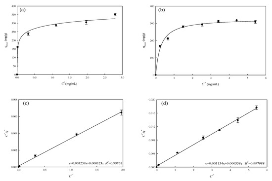 Isothermal adsorption behavior of P-COOH-CS-CEW for AO7 and TBO dyes (initial dye concentration: 0.1–5.0 mg/mL) was investigated, and the results are shown in Figure 8a,b and Table 1. The experiment data were fitted to three equilibrium isotherm models (Langmuir, Freundlich, and Langmuir–Freundlich models) using Equations (1)–(3), respectively [46]: