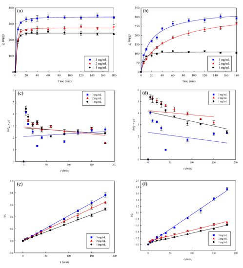 Figure 9a–f and Table 2 show the results of the kinetics of dye adsorption by P-COOH-CS-CEW nanofiber membrane at various concentrations of dyes (1–3 mg/mL). It was found that the adsorption of AO7 and TBO ceased after about 30 min (Figure 9a) and 90 min (Figure 9b), respectively. Therefore, P-COOH-CS-CEW nanofiber membrane has a higher selectivity for AO7 dye than TBO dye. When the initial dye concentration increased from 1.0 to 3.0 mg/mL, the concentration of adsorbed AO7 dye increased from 236.57 to 337.75 mg/g; in contrast, the concentration of adsorbed TBO dye increased from 104.49 to 304.33 mg/g. The increase in concentration of adsorbed dyes led to a higher removal rate because of the difference in concentration between liquid and solid (membrane) phase. The drastic concentration difference between adsorbent and liquid phase facilitates the collision between dye molecular and membrane binding site. As CEW proteins are immobilized on the surface of the P-COOH-CS-CEW nanofiber membrane, the adsorption of dye molecules at the outer surface of the membrane was expected.