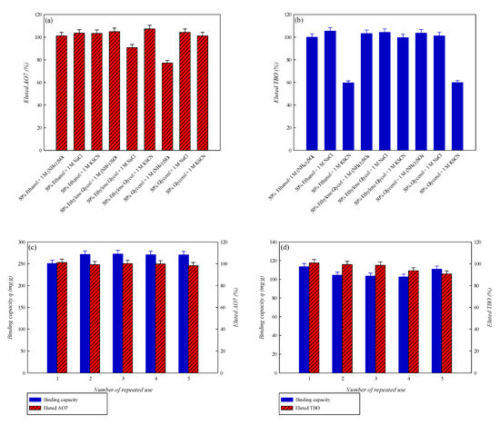 Studies of adsorption–desorption characteristics are crucial for assessing the regeneration and reusability of the membrane adsorbent. To study the possibility of regenerating P-COOH-CS-CEW nanofiber membrane for multiple rounds of adsorption-desorption, various salts [1 M, NaCl, (NH4)2SO4, and KSCN] dissolved in different organic solvents (50% ethanol, ethylene glycol, and glycerol) were used for desorption. As shown in Figure 10a,b, depending on the combinations of organic solvents and salts as dye-elution reagent, the complete elution of AO7 and TBO dyes from P-COOH-CS-CEW nanofiber membrane can be attained. This implied that the electrostatic or van der Waals forces were present between dye and binding site on the nanofiber membrane. However, there may be other intermolecular forces between the dye and protein on the P-COOH-CS-CEW nanofiber membrane (e.g., hydrophobic and hydrogen bonding). The adsorbed dyes, either AO7 or TBO, can be thoroughly eluted from the P-COOH-CS-CEW nanofiber membrane by 1 M NaCl solution containing 50% ethanol, as shown in Figure 10c,d. Finally, after five adsorption–desorption cycle tests, the binding capacity of P-COOH-CS-CEW nanofiber membrane for both dyes remained at ~97%, indicating that the P-COOH-CS-CEW nanofiber membrane has good potential for the repeated use in dye wastewater treatment.