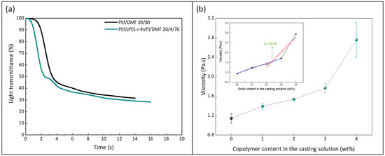 Effect of the copolymer on (a) kinetic of phase separation and (b) viscosity of the casting solution (0 wt% corresponds to the casting solution used to form the virgin membrane P20-Z0). Measurements performed at 25 °C. (Inset: determined chain entanglement concentration of the PSf/copolymer/DMF system).