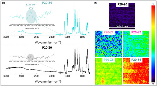 Chemical characterization of membranes by FT-IR (a) ATR-FTIR characteristic spectra of virgin (P20-Z0) and zwitterionic (P20-Z4) membranes. (b) Mapping FT-IR analysis of the different membranes, performed at 1727 cm−1 (C=O).