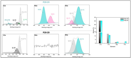 C1s, N1s, and O1s core-level spectra of P20-Z0 and P20-Z4 membranes and their corresponding elemental compositions.