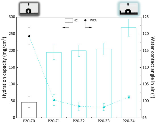 Here, we chose to modify the polysulfone membrane with a zwitterionic copolymer via in-situ modification. Although surface segregation occurs during the phase inversion of such membranes prepared by blending a hydrophobic polymer with a more amphiphilic copolymer [45], not all molecules of the copolymer can be found at the surface. Thus, compared to a surface modification process (grafting, coating), the surface properties, including the water contact angle (WCA) in air, cannot be importantly modified. It is seen here in Figure 8 that the WCA in air of the modified membranes was about 100°, while it was 120° for the virgin membrane. While this does show some improvement of the hydrophilicity of the surface, this is certainly not low enough to prevent fouling of the membrane surface in water. However, when the membrane is used in separation, it is usually immersed for some time in the aqueous environment. Wetting may take time but does occur when the amphiphilic material has been blended with the hydrophobic polymer. The WCA in air was measured a few seconds after dropping water on the surface of the membrane, and so it does not represent the actual affinity of the modified membranes with water when contacted with the liquid environment for a time long enough to establish hydrophilic interactions. Hydration capacity (HC) measurements, however, involve a 24-h immersion of the membrane material with DI water. The results of Figure 8 show an important increase in HC when comparing the virgin membrane to the modified ones. While it was measured to be about 50 mg/cm3 for the virgin membrane, it almost reached 275 mg/cm3 for P20-Z4 membrane. This result proves that water molecules can be more easily trapped in the bulk of the modified membrane, physically (in the pore) or chemically (interactions with the zwitterionic heads), because of the modification of the casting solution with the amphiphilic copolymer. Hence, the modified membranes should be less prone to fouling than the virgin PSf membrane.