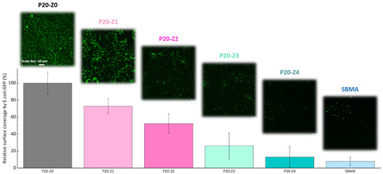 Bacteria are commonly found in wastewater [46] and the presence of these pathogens may pose a threat to the environment and to people. Pathogenic Escherichia coli have been identified in sewage treatment plants [47]. Removal of these pathogens can be achieved by porous membranes, but biofouling of the membrane material by these microorganisms can quickly occur [48], resulting in a severe decrease in permeability. Ideally, a membrane surface should resist bacterial attachment to mitigate the effect of biofilm formation.