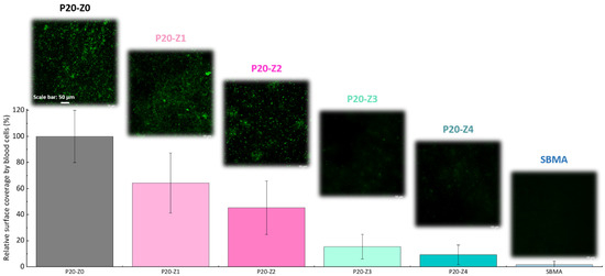 Here, we challenged the membranes against whole blood. As in the bacterial attachment test, membranes were incubated with whole blood and their surface observed by confocal microscope after fixing/staining the cells. The results provided in Figure 10 (1) demonstrate the efficiency of the copolymer in improving the blood compatibility of polysulfone membranes, (2) confirm that the blending method can be an efficient means to improve the blood compatibility of hydrophobic membranes and (3) show that despite not being entirely zwitterionic, unlike the SBMA control, P20-Z4 almost competes with purely zwitterionic hydrogel materials. These results could not have been obtained without a homogeneous and dense distribution of the copolymer on the surface of the membrane (Figure 8). The use of methanol as a first non-solvent bath likely facilitated diffusion of the copolymer chains leading to surface segregation (compared to the use of pure water which would lead to faster phase inversion and so faster solidification of the polymeric domains). Ultimately, it contributed to the excellent resistance to blood.