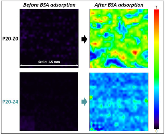 Effect of the additive on BSA adsorption. FT-IR maps at 1650 cm−1 of P20-Z0 and P20-Z4 before and after incubation with BSA solution.