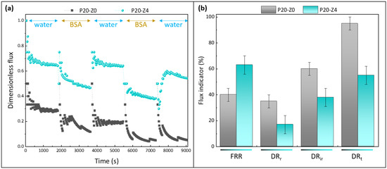 Membrane resistance to biofouling was also evaluated in dynamic conditions (as opposed to attachment tests that were static) by carrying out filtration tests with a protein solution. Bovine serum albumin is classically used to study membrane fouling during filtration, whether membranes fall in the microfiltration domain [61,62,63,64], or in the ultrafiltration range [65,66]. Here, filtration was carried out in dead-end mode. This configuration promotes the interactions of biofoulant materials with the membrane material by orienting the feed flux directly towards the membrane surface. Hence, short-term tests are sufficient to compare the antifouling performances of membranes. Tests were run with the pristine PSf membrane (P20-Z0) and the zwitterionic PSf membrane (P20-Z4), and results shown in Figure 12. The purpose of these tests was not to focus on rejection but to study the effect of the copolymer on the antifouling property during filtration. However, it is worth noting that the rejection after one cycle was 80.8 ± 0.6% using P20-Z0, while it increased to 95.6 ± 2.2% using P20-Z4 (measured from three independent tests).