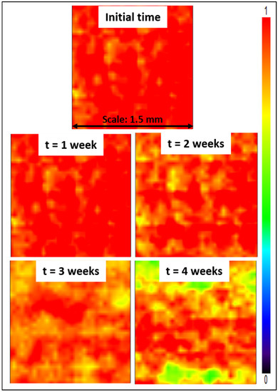 Lastly, stability tests were conducted, consisting in immersing Z4 membranes for several weeks in a DI water bath. Subsequently, mapping FT-IR analyses were conducted. The purpose was to study the effect of the long-term immersion on the zwitterionic copolymer release from the membrane surface. The stability of membrane modification relies on hydrophobic–hydrophobic interactions in the case of in-situ modification (i.e., initial blending followed by phase-inversion). The hydrophobic forces are challenged by hydrophilic forces at play between the zwitterionic units of the copolymer and water from the aqueous environment in which membranes are immersed. These hydrophilic forces may result in the leaching of copolymer molecules, and so in a gradual loss of antifouling properties. Partial leaching of the zwitterionic copolymer from the polysulfone membrane could be detected from the results of Figure 13, as a change in color associated with a change in copolymer surface density. Nevertheless, it is undeniable that a large proportion of copolymer still remained trapped in the bulk of the membrane after 4 weeks, with a dominating orange-red color. Comparing these data with those presented earlier in Figure 6, the surface of the Z4 membrane immersed in DI water for several weeks still displayed a higher copolymer density than the surface of the Z3 membrane. Thus, the loss of material, though detectable, remains small and controllable.