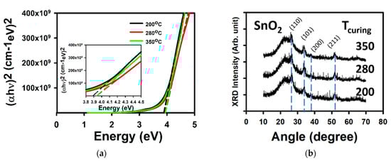 Figure 1 shows the optical and crystalline properties of SnO2. Figure 1a shows the extraction of the band gap from the Tauc plot [20]. The films with a Tcuring of 200, 280, and 350 °C had a respective bandgap of 3.89, 3.94, and 3.94 eV. The films are adequate for application in invisible electronics [1]. Figure 1b shows the results of the XRD measurements. For all Tcuring, the thin films demonstrate the crystalline structure. Peaks related to the (110), (101), (200), and (211) are all observed. They are located at 26.6°, 33.8°, 37.8°, and 51.8°, respectively, for the thin film with the Tcuring of 280 °C.