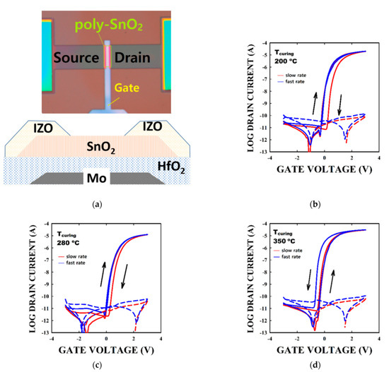 The typical poly-SnO2 TFT structure used in this work is shown at the bottom of Figure 3a. The micrograph of the TFT shown on top of Figure 3a reveals the various elements constituting the TFT. The hysteresis of the TFT transfer curves measured at fast and low rates, when SnO2 was cured at 200, 280, and 350 °C are shown in Figure 3b–d, respectively. On average the TFTs made with a SnO2 thin film cured at 200, 280, and 350 °C show a linear mobility of 86 ± 12, 90 ± 12, 110 ± 35 cm2/Vs; a Vth of −0.04 ± 0.05, 0.02 ± 0.12, −0.19 ± 0.14 V; and a subthreshold swing of 103.7 ± 9.9, 112.9 ± 9.4, and 102.7 ± 8.4 mV/dec. We note that the reliability of the extraction of the mobility in particular is highly depending on the size of the TFT [22]. The size chosen in the study should not have a significant impact on the mobility value [15,22]. We gather in Table 1 our present results and various other TFT performances using polycrystalline oxide semiconductors.
