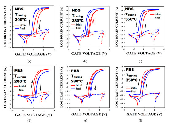 Figure 4a–f show the variation in the hysteresis under NBS (PBS) for TFT using SnO2 having Tcuring of 200 (Figure 4a,d), 280 (Figure 4b,e), and 350 °C (Figure 4c,f), respectively. As shown in Figure 4a–c, all curves shift negatively under NBS. Interestingly, the direction in the hysteresis changes in the 280 °C-cured SnO2 based TFT from clockwise to anticlockwise (Figure 4b). Besides, the hysteresis becomes close to 0 V for the 200 °C-cured SnO2 TFT. Not only did we consider the change in the transfer curve (the IDS curve), we also considered the evolution of the gate leakage current (the IGS curve). Under NBS, IGS increases by almost an order of magnitude in all TFTs. The anticlockwise hysteresis appearing under NBS suggests that holes could enter the dielectric during the stress.
