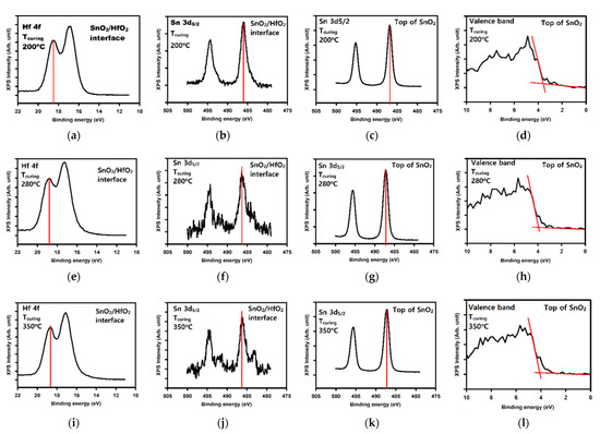 Therefore, for each curing temperature we extracted the following peak values: the Hf 4f peak at the SnO2/HfO2 interface (as shown in Figure 5a,e,i), the Sn 3d5/2 peak at the SnO2/HfO2 interface (as shown in Figure 5b,f,j), the Sn 3d5/2 peak on the top of the SnO2 layer (Figure 5c,g,k), and the valence band at the top of the SnO2 layer (as shown in Figure 5d,h,l). The various extracted values are gathered in Table 2. We note that the values for the position peaks taken for HfO2 without SnO2 on top are taken from a previous report [16] and we consider the Hf 4f peak position EHf4f = 18.15 eV, the bandgap of HfO2 EgHfO2 = 5.34 eV, and the position of the valence band EVBM = 2.4 eV.