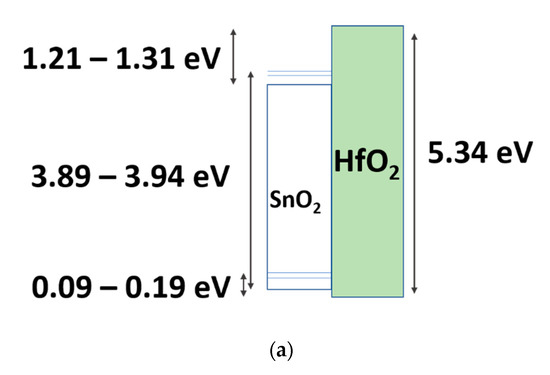 Also, we note that holes should be moving slowly in SnO2, as they would in IGZO with a mobility of ~0.01 cm2/Vs [28]. Under NBS, holes may be injected from the SnO2 layer to the dielectric and be trapped, resulting in a negative shift and the anticlockwise hysteresis. This also explains the change of the hysteresis direction for the 280 °C-cured SnO2 based TFT shown in Figure 4b. Therefore, we propose that the main phenomenon responsible for the hysteresis in our solution-processed SnO2 TFT is the trapping of holes in the dielectric. Detrapping or trapping of holes would therefore monitor the hysteresis. Figure 6 shows the band offsets between HfO2 and polycrystalline SnO2 Figure 6a summarizes the bandgaps (3.89–3.94 eV for SnO2, 5.34 eV for HfO2), ΔEv (0.09–0.19 eV), and ΔEc (deduced from the previous values). To find ΔEv, we used the values taken from Figure 5, and gathered in Table 2. Figure 6b,c summarize the proposed mechanism of the hole extraction (injection) during PBS (NBS).