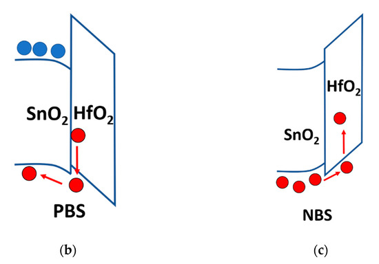Band offsets of polycrystalline SnO2 and HfO2. (a) Measured band offsets by XPS, (b) hole injection into the SnO2 layer under PBS, (c) hole injection into the HfO2 layer under NBS.