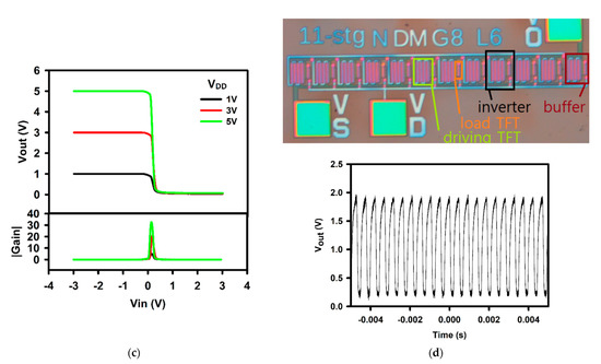 We fabricated both inverters and ring oscillators as circuits to demonstrate the possibility to incorporate SnO2 TFT in more advanced circuitry. We chose the devices with a curing step at 280 °C. Indeed, the TFTs showed the clockwise hysteresis. Compared to the 200 °C cured TFTs, the 280 °C-cured TFTs demonstrated smaller hysteresis and higher mobility. We note that the ring oscillators using the TFTs with the anticlockwise hysteresis could not show any oscillation. Figure 7a,b show the respective schematics of an inverter and a ring oscillator (R.O.). The inverter output is shown in Figure 7c. At 5 V the gain is ~30 V/V. The top of Figure 7d shows the optical image of a fabricated ring oscillator, and its various components. In the figure, we indicated the basic inverter structure, but also the buffer. The bottom of Figure 7d shows the output of the R.O. at a Vdd of 3 V. The peak-to-peak voltage (Vpp) is 1.862 V, the frequency is 2.12 kHz. Even though the operating frequency is rather low, which could be due to the low sheet resistance of IZO (~20 ohm/), and the non-optimized ratio of the TFTs, the present results demonstrate the possibility to further include poly-SnO2 TFTs in other more advanced circuitry.