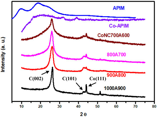 The X-ray diffraction pattern of APIM reveal it is not well-crystallized in the presence of OPAl. The ortho-substituted structure of OPAl can make the backbones of the polymers curved easily and significantly decrease the crystallinity in accordance with Figure 3. After introducing Co ions to prepare Co-APIM, the imperfect crystalline structure collapses, and the diffraction peaks seen in APIM disappear and are replaced with small peaks around 2θ = 33 and 41°, which might contribute from the residual CoCl2 crystals. After being subjected to calcination, beginning from 600 °C, all elements start to reorganize and develop the CoNC framework structure. Most of the carbon of the benzene rings organize into a robust conjugated honeycomb like graphene (GF) or carbon nanotube (CNT) and demonstrate characteristic diffraction peak at 2θ = 26.5° belonging to the C (002) plane, which became sharpener with temperature, as seen in Figure 2. An additional plane related to the carbon structure C (101) can be seen as well, but it is not significant. The evidence of Co-N bonding is not available in the X-ray diffraction pattern since captured Co are not able to crystallize. However, some Co elements formed and crystallized at a high temperature, contributing to the Co (111) plane in all CoNCs treated at a temperature higher than 600 °C in the N2 atmosphere. Actually, Co elements are not stable at high temperatures, and they can be easily bonded with other non-metal elements such as N2 gas at such temperatures. The presence of Co metal crystals comes from the protection of the surrounding inert carbon crystals (GF or CNT) that crystallize around Co crystal particles, preventing them from bonding with N2 gas (will be discussed in the TEM section).