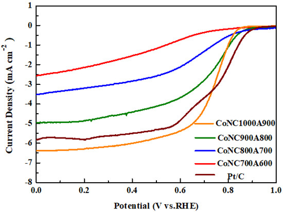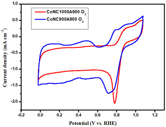 The current–potential polarization (CV) curve of CoNC1000A900 in Figure 7 demonstrate significantly sharp ORR peaks at 0.8 V in the O2-saturated KOH(aq), directly indicating that it is a qualified ORR catalyst. Similar broader peak is also seen for CoNC900A800 around 0.8 V, indicating its electro-activity is still high.