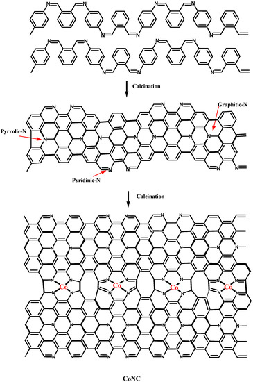 The different binding energy spectra of N1s of various CoNCs were used to characterize the percentage of nitrogen in the form of pyridine, pyrrole, graphene, Co-N., etc., after calcination with an XPS instrument assembled by Fison (VG) -Escalab 210 (Fison, Glasgow, UK) using Al Kα X-ray source at 1486.6 eV. The pressure in the chamber was kept at 10−6 Pa or less during measurement. The binding energies of the N1s around 400 eV were recorded.