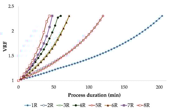 The change in volume reduction factor (VRF) value during reverse osmosis process of conventional and ecological red wines at different processing parameters. Abbreviations: R—reverse osmosis process; 1—2.5 MPa with cooling; 2—3.5 MPa with cooling; 3—4.5 MPa with cooling; 4—5.5 MPa with cooling; 5—2.5 MPa without cooling; 6—3.5 MPa without cooling; 7—4.5 MPa without cooling; 8—5.5 MPa without cooling.