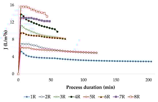 In this study, the reverse osmosis process of red wine resulted in 1.3 L of retentate and 1.7 L of permeate. According to these values, the volume reduction ratio was calculated, and a value of 2.31 was obtained for each experimental run. The VRF value increased during the reverse osmosis process of red wine (Figure 1) as a result of the reduction of the retentate volume. However, if the permeate flux was lower (at lower pressures and cooling regime), it took more time to obtain the desired VRF. Along with that, a permeate flux decline was observed in each experimental run, which is presented in Figure 2. The permeate flux decline was a result of membrane fouling, retention of small molecules, an osmotic pressure increase at the membrane surface, and concentration polarization []. Further, it also was observed that at 2.5 MPa with cooling, the reverse osmosis process lasted for 204 min. When a higher pressure or higher temperature were applied, the RO process was shorter, and the shortest one was at 5.5 MPa without cooling (44 min).