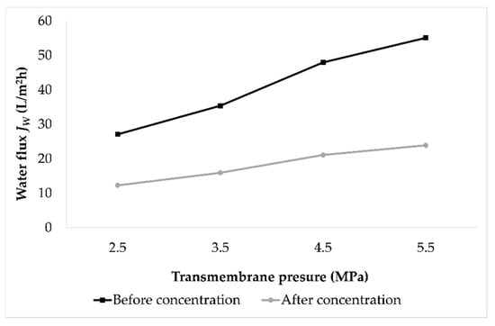 In order to estimate the membrane fouling that caused permeate flux decline, the fouling index was calculated. For that purpose, the pure water flux was measured at 2.5, 3.5, 4.5, and 5.5 MPa before and after each experimental run. Average values of fouling indices of all experiments at certain pressure were calculated, and are presented in Figure 3. It was observed that the water flux was higher at a higher pressure. However, after the concentration process, the water flux was significantly lower compared to the water flux before the concentration process at the same applied pressure. The water flux decrease was expressed as the fouling index (Table 2). The fouling index ranged from 54.68 to 56.61%, and was slightly higher when higher pressure was applied.