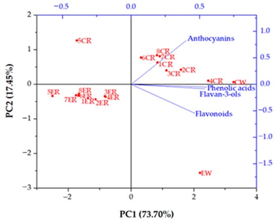 Principal component analysis (PCA) biplot of phenolic profiles of initial conventional and ecological red wines and their RO retentates. Abbreviations: CW—initial conventional wine; CR—reverse osmosis retentate of conventional wine; EW—initial ecological wine; ER—reverse osmosis retentate of ecological wine; 1—2.5 MPa with cooling; 2—3.5 MPa with cooling; 3—4.5 MPa with cooling; 4—5.5 MPa with cooling; 5—2.5 MPa without cooling; 6—3.5 MPa without cooling; 7—4.5 MPa without cooling; 8—5.5 MPa without cooling.