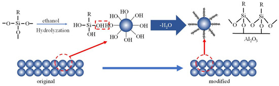 The surface modifier was prepared by mixing the concentrated C16 with ethanol and a certain amount of nitric acid (about 3 mL 0.1 mol/L HNO3 per 1 L solution) to 0.1 mol/L C16 at room temperature for 24 h. The raw tubular membranes were dried and immersed into the modifier solution at 30 °C for 12 h. In the modification process, the –OCH3 group in silane molecule undergoes hydrolysis reaction to form silanol (R–Si–(OH)3) to possess hydrophobicity (Figure 1). The modified membranes were taken out and rinsed with deionized water and then dried at 110 °C for 6 h for curing the silane-modified silica to improve the stability of the hydrophobic membrane. Roughly, 1 L modified solution can be used for 5 membrane tubes. The membranes were stored at room temperature. The properties of the tubular asymmetric α-Al2O3 membrane to be characterized include water contact angle, gas permeation and morphology. The water contact angle of the ceramic membranes was measured by a contact angle analyzer (Dataphysics-OCA20, DataPhysics Instruments GmbH Co., Ltd., Filderstadt, Germany). The porosity of the membrane was characterized by an ellipsometry device (Complete EASEM-2000U, J.A. Woolam, Lincoln, NE, USA). The tests of gas permeation were carried out to investigate the effect of hydrophobic modification on membrane microstructure. Pure N2 was used to investigate the gas permeation. The test module containing a ceramic membrane with 11 cm length was prepared to determine the N2 permeance of the membrane. The upstream pressure was increased at 0.05 MPa intervals up to 0.4 MPa. The N2 was fed into the lumen side of the module, and the permeation rates were measured at 25 °C in the shell side using a rotor flow meter. The morphology of the membrane was assessed using field emission scanning electron microscopy (FESEM, S-4800, Hitachi High-Tech, Tokyo, Japan).