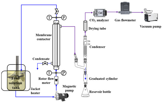 The schematic diagram of the experimental setup for CO2 desorption is shown in Figure 2. A hydrophobic tubular asymmetric α-Al2O3 membrane was encapsulated in a 304 stainless module to form the membrane contactor. The characteristics of the membrane contactor are presented in Table 1. The CO2-rich aqueous MEA solution in a heating tank was continuously pumped into the lumen side of the membrane contactor and then recycled back to the tank. The liquid flow rate was controlled by a rotameter (accuracy: ±2%). The temperatures and pressures of the solvent at the inlet and outlet of the membrane contactor were monitored using PT100-type thermal sensors (0−200 °C) and SIN-P300 pressure transmitters (0−0.6 MPa), respectively. In addition, the reduced pressure of the permeable side of the membrane contactor is generated by a vacuum pump and is determined by a pressure transmitter (−0.1–0 MPa). The vaporized H2O was extracted from the membrane contactor and then was condensed. The condensate was determined by a precise graduated cylinder. The stripped CO2 was online measured by a gas flow totalizer (D07-19B, Beijing Sevenstar Electronics Co. Ltd., Beijing, China), which enables converting it into the standard state by automatic temperature calibration and connecting to a computer to collect instantaneous and cumulative flow rates once per second.