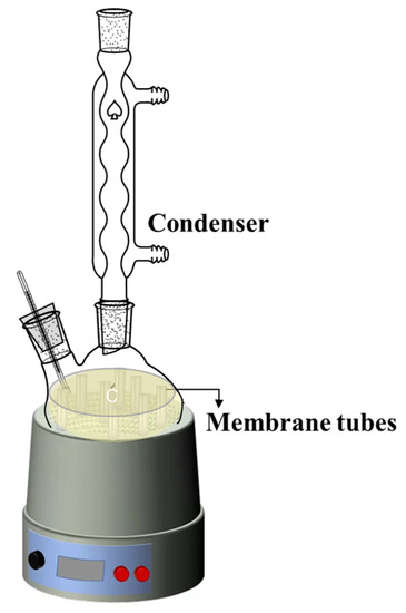 The thermal and chemical stability of the membranes was studied as follows: the asymmetric α-Al2O3 membranes were immersed in a 5.0 mol/L MEA solution at 373 K for 30 days, as shown in Figure 3. After the 30 days of immersion, the membranes were taken out and washed with distilled water, then dried at room temperature. Then, the membrane samples were studied via FESEM analysis and gas permeation.