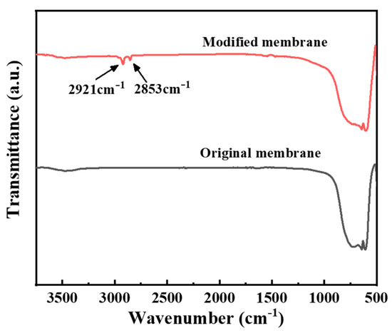 To characterize the hydrophobic membrane, Fourier transform infrared spectrum (FTIR) determination was firstly conducted to see the bond variation. It can be observed in Figure 4 that the asymmetric stretching vibration peaks and symmetric stretching vibration peaks of –CH2– appeared at 2921 cm−1 and 2853 cm−1 on the modified spectrum, indicating that the silane molecules have been successfully grafted to the surface of the ceramic membrane. Subsequently, the cross-sectional and surface roughnesses of the original membrane and the modified membrane are determined via FESEM and AFM, as presented in Figure 5 and Figure 6, respectively. No obvious change can be observed from the FESEM and AFM images of the membranes before and after hydrophobic modification, indicating that the effect of the hydrophobic modification using C16 on membrane microstructure was insignificant.